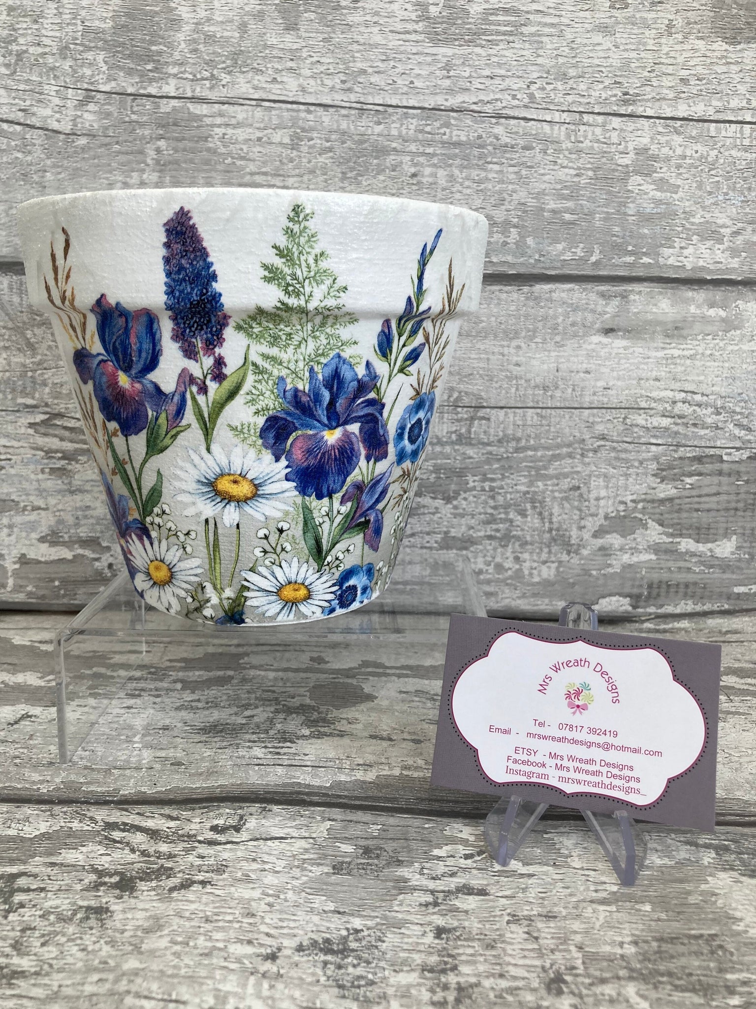 This pot has been painted with masonry paint, decoupaged and sealed with a weatherproof, waterproof non yellowing varnish