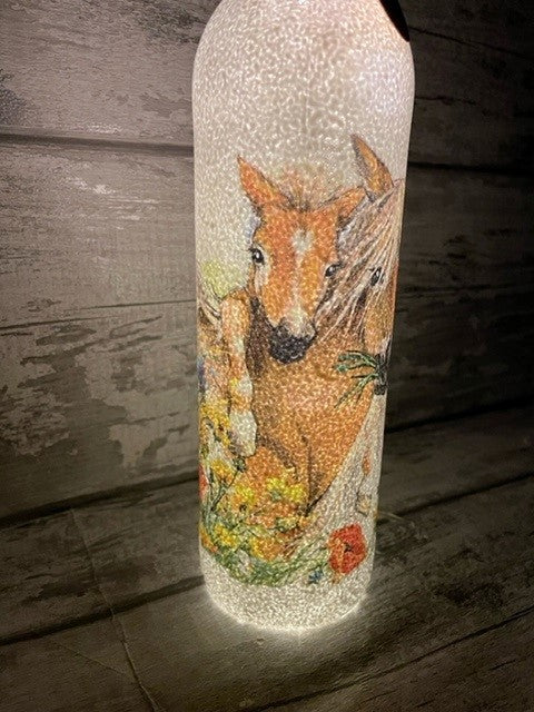 This light up bottle  has been hand painted, decoupaged with this beautiful design, varnished with a waterproof varnish and finished off with a handmade with love tag, perfect to be given as a beautiful gift