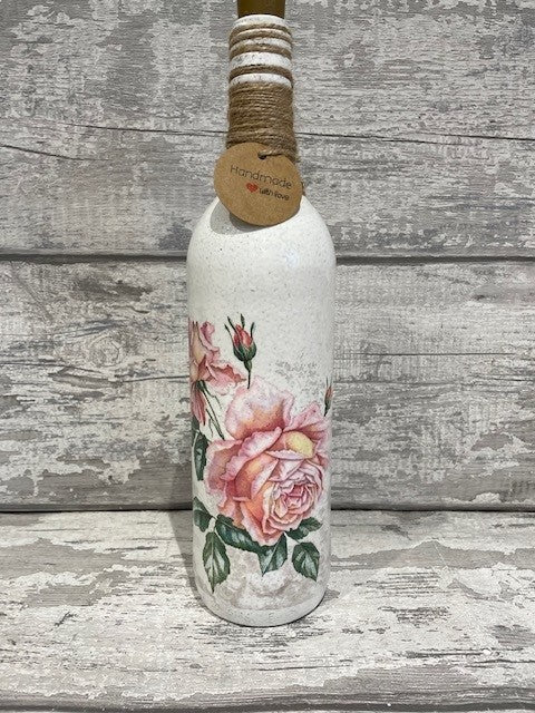 This light up bottle has been hand painted, decoupaged with this beautiful design, varnished with a waterproof varnish and finished off with a handmade with love tag, perfect to be given as a beautiful gift