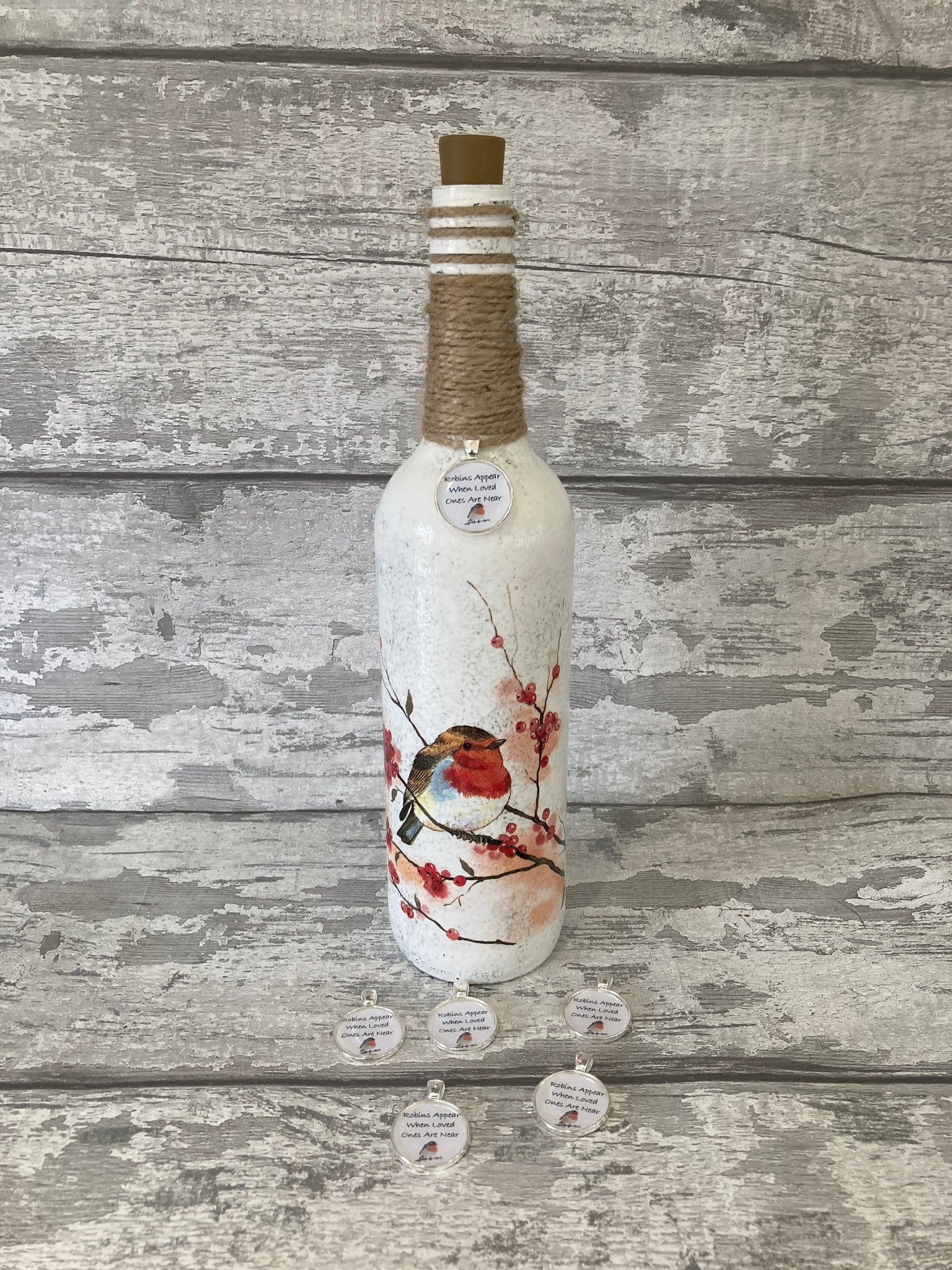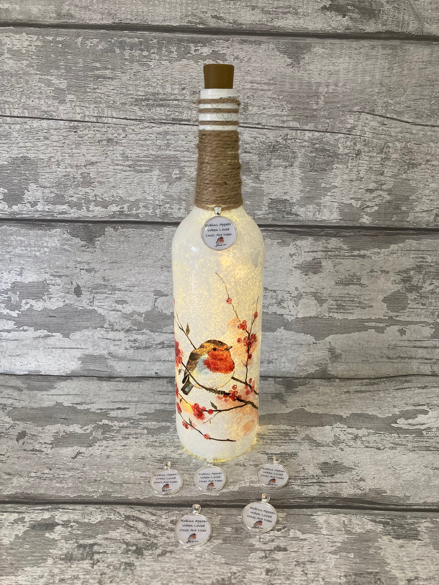 This light up bottle  has been hand painted, decoupaged with this beautiful design, varnished with a waterproof varnish and finished off with a handmade with love tag, perfect to be given as a beautiful gift