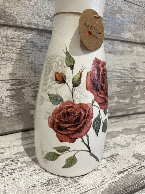 The glass vase has been hand pained, decoupaged with this beautiful design, varnished with a waterproof varnish and finished off with a handmade with love tag, perfect to be given as a beautiful gift