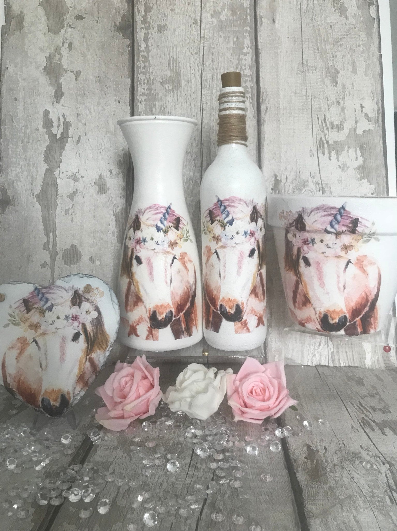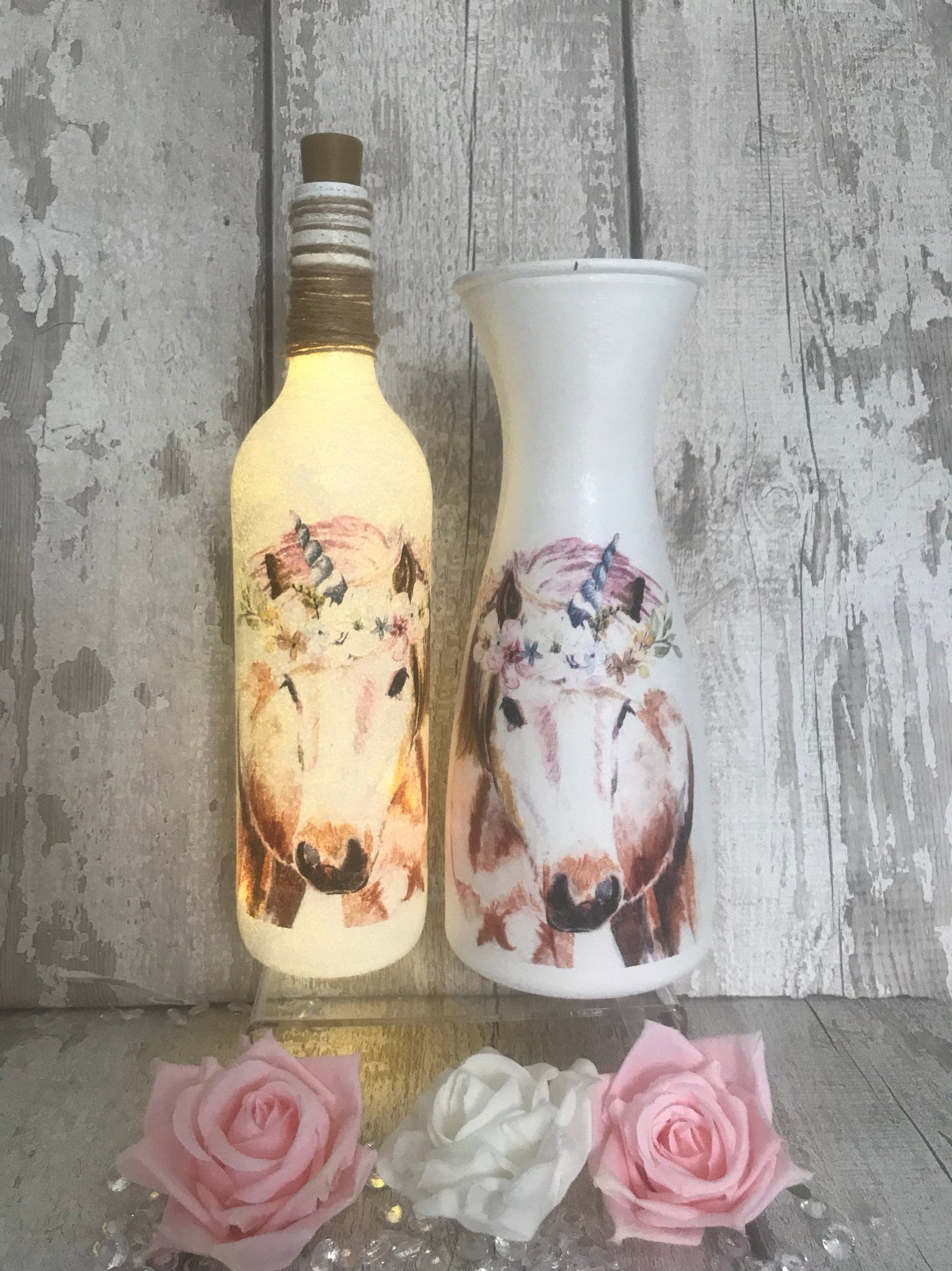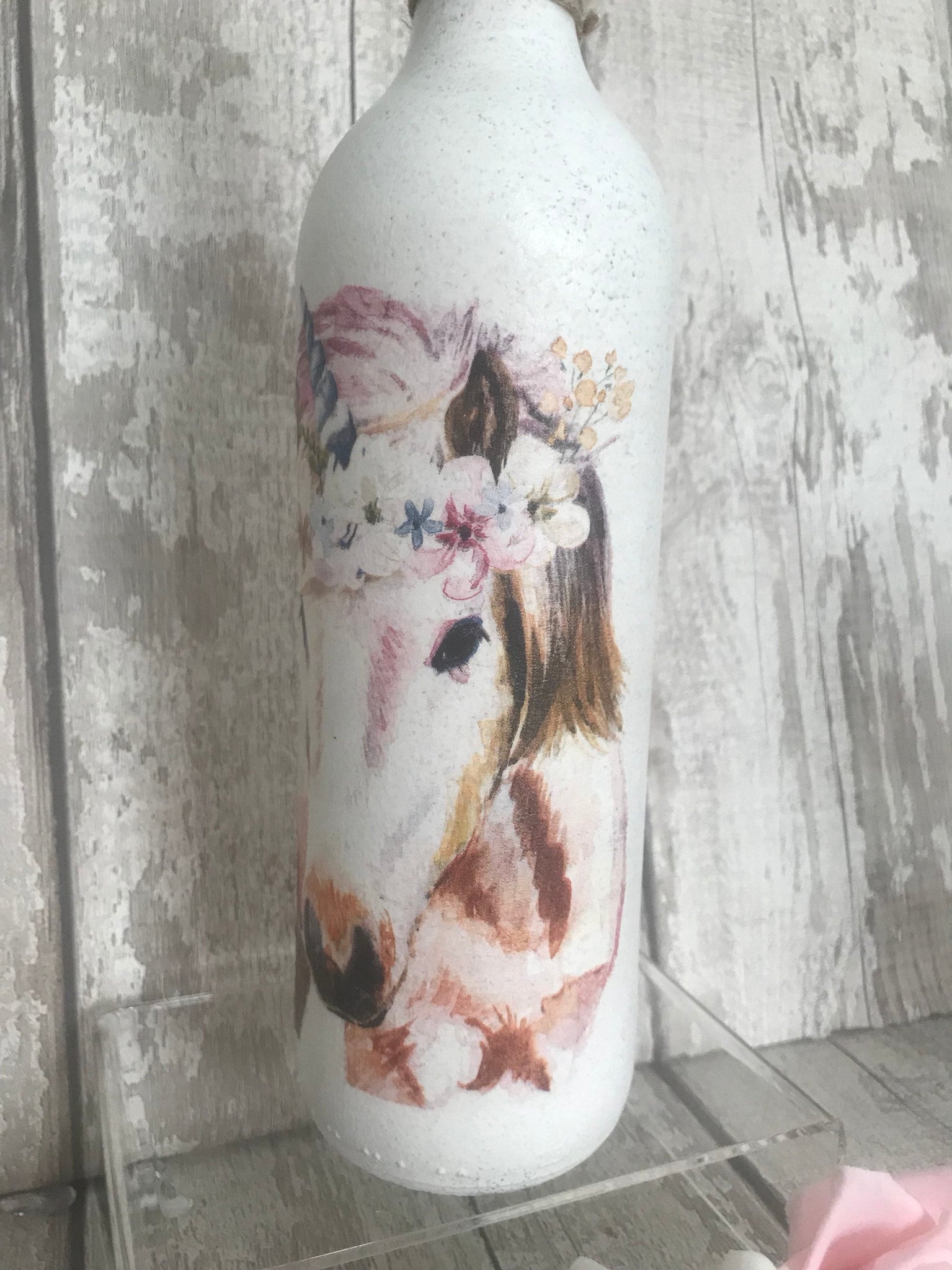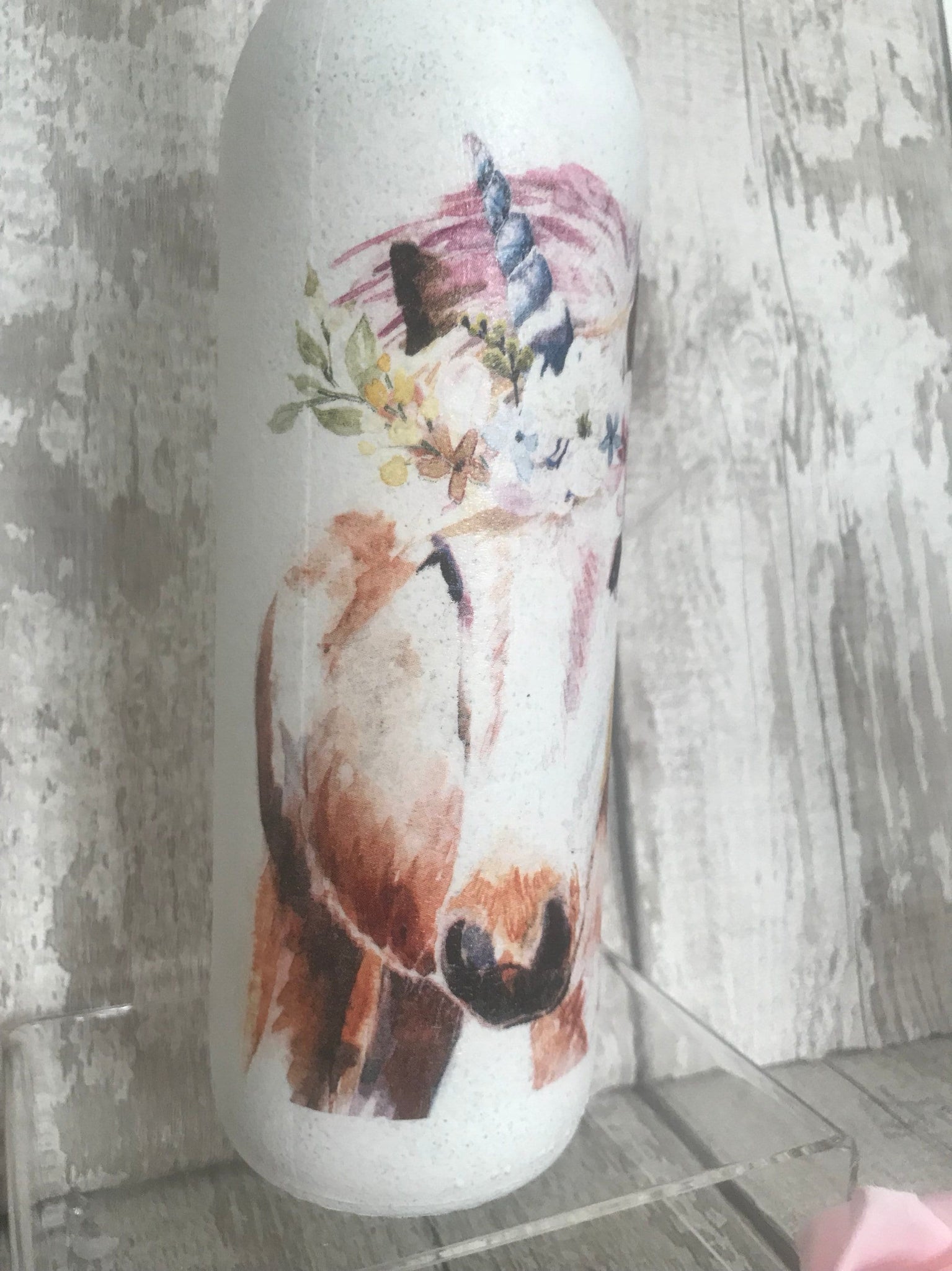 This light up bottle  has been hand painted, decoupaged with this beautiful design, varnished with a waterproof varnish and finished off with a handmade with love tag, perfect to be given as a beautiful gift